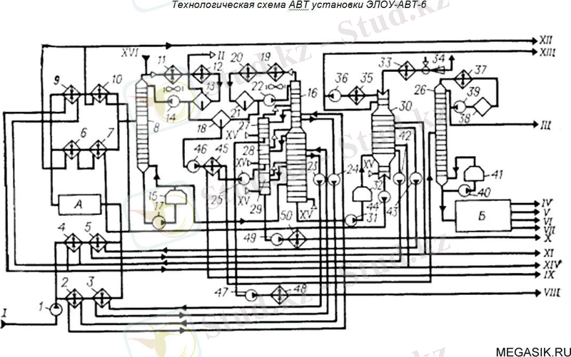 А - электр дегидраторлар блогы; В - бензинді қайталама айдау блогы; I - май; II - газ; III - тұрақтандыру басы; IV-VII - тар бензин фракциялары; VIII - фракция 180-230 ° C; IX - фракция 230-280 ° C; X - фракция 280-350 ° C; XI - 350-500 oС фракциясы; XII - шайыр (500 ° C жоғары фракция) ; XIII - 350 oС төмен фракция; XIV - 400 ° C жоғары фракция; XV - су буы; XVI - коррозия ингибиторы.