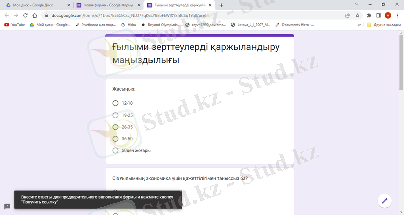 Зерттеу әдісін сипаттау: Тақырыпты ашу мақсатында сандық және сапалық зерттеу жүргізіледі. Сандық-статистикалық ақпарат алу мақсатында сауалнама 74 респонденттен алынды. Бұған қоса, экономика саласындағы ғылыми зерттеулерді қаржыландыру туралы білімі бар маманнан интервью алынады.