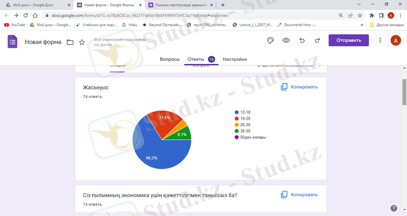 1-сауалнама сұрағы арқылы қатысушылардың жас ерекшеліктері анықталды: респонденттердің 66, 2%-ы 12 мен 18 жастағы жасөспірімдер, қалған 33, 8 %-ы 18 жастан ашқан экономикамен ақпараттандырылуы мен құзыреттілігі жоғары адамдар.