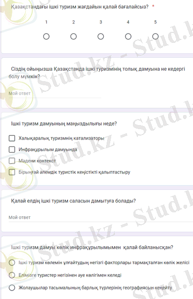 Сауалнама өзі 5 сұрақтан тұратын және оның 2-еуі ғана ашық сұрақ түрінде келген. Ашық сұрақ дегеніміз толық түсіндерме мен себепті талап ететін сұрақ түрі.