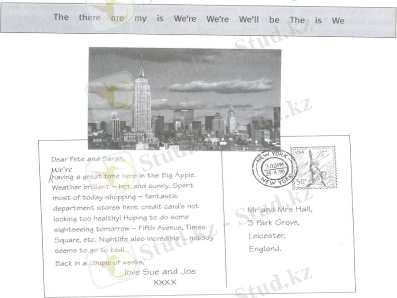 Сонда оқушылар өздерін демалыста жүргендей елестетеді. Олар өздерінің демалысын/мерекелерін жұптарда немесе шағын топтарда талқылай алады, олар картаны қайдан жіберетінін және олармен сөйлескісі келетінін шешеді. Мұғалім оқушыларға қандай сөз тіркестерін елемеуге болатынына, ашық хаттардың құрылымына ерекше назар аударуы керек.