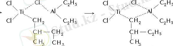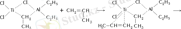 Полимерлену процесінің алдында Ті атомында мономер молекуласы координацияланады және Ті - Сl байланыстарын үзу есебінен комплекс құрамына мономер енеді. Сонымен бірге мономер π - электрондар доноры рөлін атқарады, ал катализатордың өтпелі металы вакантты d - орбитальдарының болуының арқасында акцептор болып табылады. Донормен координациялау есебінен π - комплекс түзіледі, оның пайда болуы катализатордағы Ті - С байланысының әлсіреуіне апарып соғады және жаңа алтымүшелі комплекс түзіп одан әрі оны төрт мүшеліге қайта құратын осы байланыс бойымен мономерді енгізу жеңілденеді. Этилен туындыларының полимерленуін келесі схема бойынша келтіруге болады: