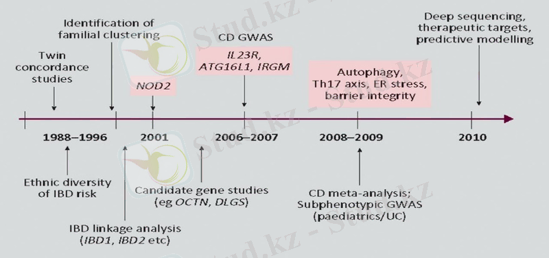 3-Сурет. Ішектің қабыну аурулары кезіндегі эпидемиологиялық және генетикалық ашылулардың хронологиясы. CD = Крон ауруы; GWAS = жалпы геномдық ассоциацияны сканерлеу; IBD = ішектің қабыну ауруы; UC = ойық жаралы колит [29] .