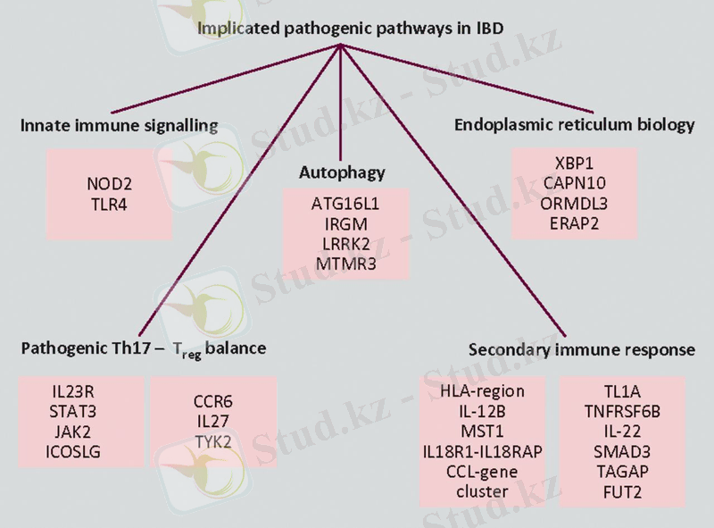 4-Сурет. Ішектің қабыну ауруының генетикалық архитектурасына кең шолу, әр жолға қатысатын расталған және потенциалды гендердің мысалдары. Treg = реттеуші Т-жасуша [39] .