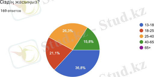 Социологиялық зерттеуді жүргізуде респонденттердің жасын білу қай әлеуметтік топқа жататынын анықтау үшін маңызды. Сол себептен бірінші сұрақ жауап берушілердің жасын анықтауға бағытталған. Респонденттердің басым көпшілігі, 36, 8% 13-18 жас арасындағы жасөспірімдер болса, 1/5 бөлігі 18-25 жастардан тұрады. Жалпы сауалнамаға қатысушылардың 1/3 бөлігі 25-40 жас арасында. Қалғандары 40-65 жастағы ересектер. Бұл сауалнаманың барлық дерлік әлеуметтік топтарды қамтығанын көрсетеді. Көбінесе ересек және бойжеткен аудитория сауалнамаға жауап беруі нәтижелердің нақтылығын және дәйектілігін көрсетеді.