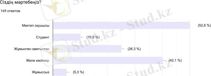 Екінші сұрақтың мақсаты - аудиторияны түсіну және нақтырақ әлеуметтік топтарды анықтау. Жауап бергендердің 1/2 мектеп оқушылары болса, 42, 1% жеке кәсіпкерлер. 1/4 бөлігі жұмыспен қамтылғандар, ал 10, 5% жоғарғы оқу орындарында білім алуда, тек 5, 3% жұмыспен қамтылмағандар. Демек, зерттеу әртүрлі топтардан қатысушылардың ойын білуге мүмкіндік береді.