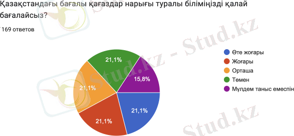 Жауап бергендердің тек 15, 8% бағалы қағаздар нарығымен мүлдем таныс емес болса, қалған 1/5 бөліктері өз білімдерін “өте жоғары”, “жоғары”, “орташа” және “төмен” деп бағалаған. Бұл сауалнама нәтижелері жан-жақты екенін және түрлі білімді халықтың ойы ескерілгенді білдіреді.