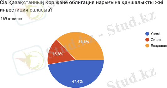 Респонденттердің көпшілігі, шамамен жартысы үнемі инвестиция салып тұратыны белгілі болды. 34, 8% болса ешқашан акцияларды сатып алып көрмеген болса, 15, 8% сирек инвестиция салып тұрады.