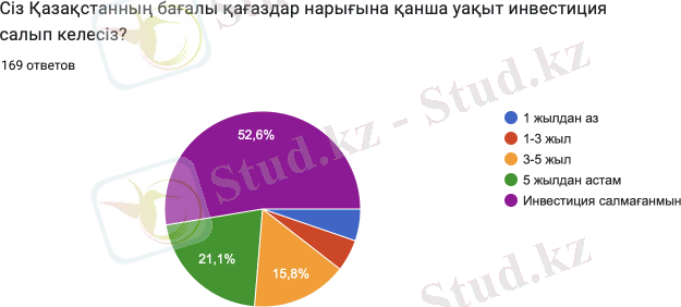 Сауалнамаға жауап бергендердің жартысынан көбі ешқашан инвестиция салып көрмеген болса, 1/5 бөлігі 5 жылдан астам инвестиция салып келеді. Респонденттердің 15, 8% үш пен бес жылдың арасында қор нарығында акцияларға ие. Демек, қатысушылардың жартысы бағалы қағаздар нарығымен жақын, өз тәжірибесінен таныс.