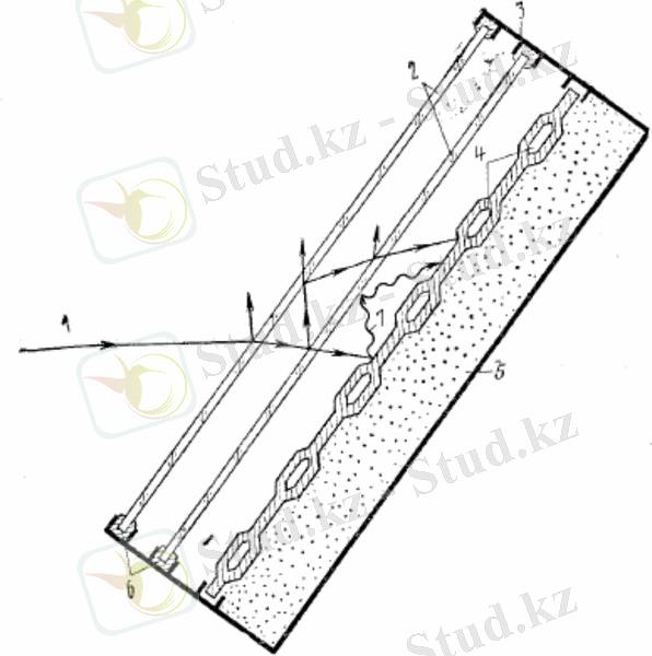 1-күн сәулелері; 2-шыны; 3-корпус; 4-жылуқабылдағыш бет; 5-жылу оқшаулағыш; 6-жылу қабылдағыш пластинаның меншікті ұзын толқынды сәулеленуі