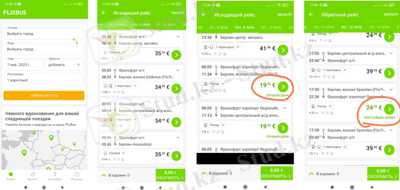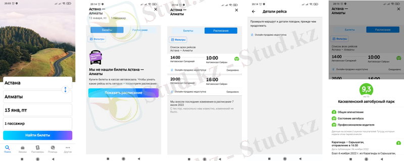 - билеттерді табу батырмасы басылады, шыққан қосымша бетінде қолданушыға мүмкін болатын барлық нұсқалар ұсынысы тұрады. Ол жерде қандай автобус қай уақытта, қандай станциядан шығатыны, қай уақытта қандай станцияға келетіні, уақыты бойынша жол ұзақтығы, тегін wi-fi, телефон зарядтау мүмкіндігі және билет бағасы салыстырылған түрде көрсетіледі. Ең тиімді баға мен ең қысқа уақыт көрсетіліп тұрады.