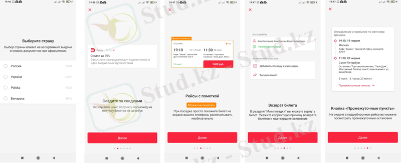 Бұл сервистің мобильдік қосымшасы Қазақстан аумағында да жұмыс істей алатынын ескерген жөн. Егер автобус билетін операторлары онлайн сатып алу мүмкіндігін бермеген болса, қосымша мүмкін болатын маршрут пен жүретін орындарын, уақыты, станциялары және т. б. қажет ақпараттарды көрсетеді. Қосымшада маршрут пен автобусқа жолайшылар ой-пікірлерін қалдыру мүмкіндігі бар. Аталғандар төмендегі суреттерде көрсетілген.