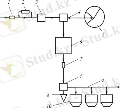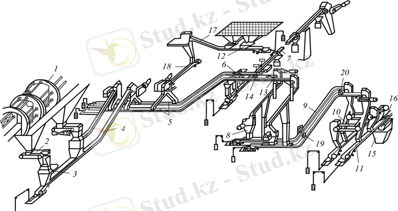 1 - вагон аударғыштар; 2 - таспалы Қоректендіргіштер; 3 - дискотекалы ұсатқыштар; 4, 17, 18 - бір жіпті конвейерлер; 5, 9 - конвейерлер; б, 16 - плужковыс түсіргіштер; 7 - қоймаға конвейер; 8 - ұсақ ұсатқыш ұсатқыш; 10 - кері қоректендіргіш; 11 - бункер галереясының конвейерлері; 12-тербелмелі қоректендіргіш; 13, 14-Барабанды және аспалы магнитті сепараторлар; 15-қазандықтағы бункер; 19-таспалы таразы; 20 - сынама алу қондырғысы.
