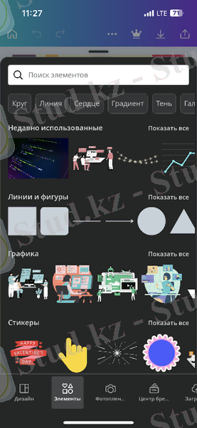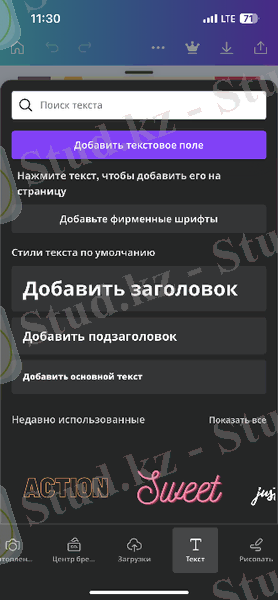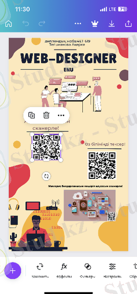 Ал енді цифрлық стендтің жасалу жолына тоқталсам. Цифрлық стендті Canva редакторлық бағдарламасы өте ыңғайлы, әрі жеңіл болғандықтан осы бағдарламада жасадым (2. 3. 4-сурет) .