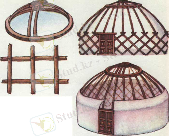 (есік, шаңырақ, кереге, уық) мен сырт көрінісі.