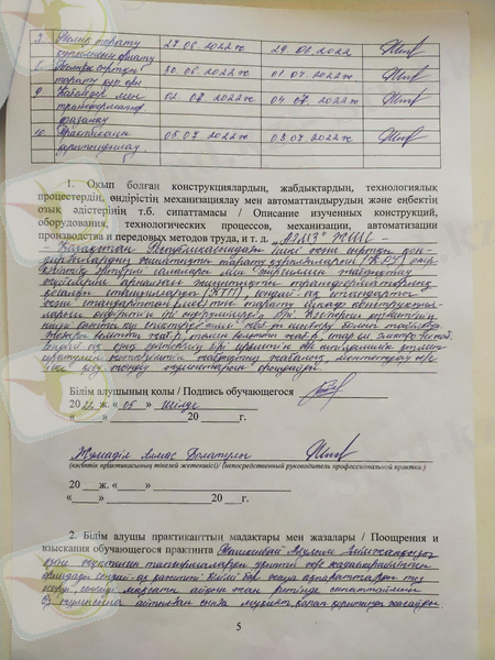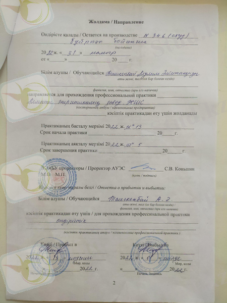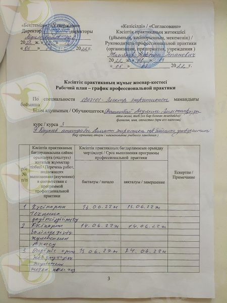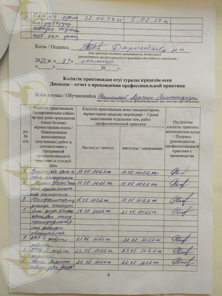 Тәжірибенің өту аралығы: 13. 06. 2022 ж. - 05. 07. 2022 ж. Өндірістік практиканы өту мақсатым болашақ мамандығымның негіздерімен танысу, нақты жұмыс жағдайында кәсіби дағдыларды дамыту, дәрістерде оқу барысында алынған теориялық материалды бекіту.
