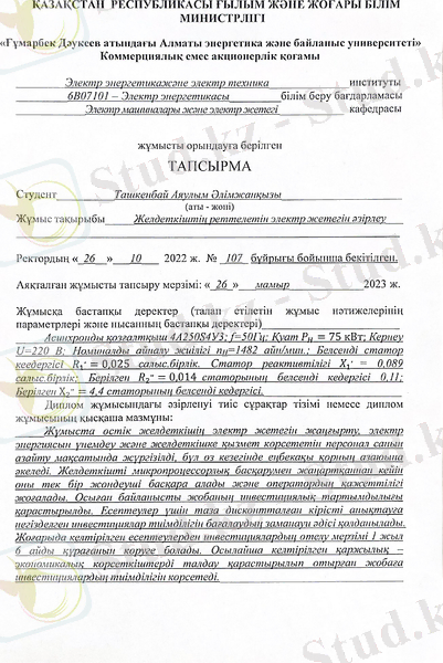 Дипломдық жұмыста үш фазалы көпір АИТ және қысқа тұйықталған роторлы асинхронды қозғалтқышты қамтитын ЖТ - АҚ жүйесі бойынша өстік желдеткіштің автоматтандырылған электр жетегінің математикалық моделі жасалады. MATLAB ортасында сатылы және сызықтық орнату әсерімен қозғалтқышты іске қосу режиміндегі виртуалды модельдегі зерттеу нәтижелері әзірленген математикалық модельдің 75кВт өстік желдеткіштің жиіліктік реттелетін электр жетегінде болатын жылдамдық пен моменттің нақты өзгерістеріне сәйкестігін дәлелдейді. Сондықтан бұл модельді АИТ негізінде ЖР зерттеу, әзірлеу және жобалау кезінде қолдануға болады.