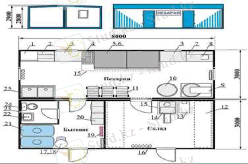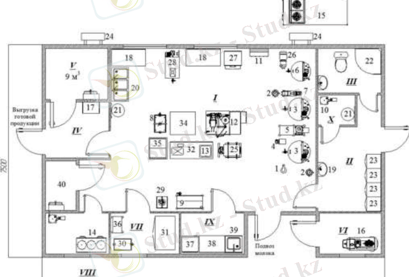 Жабдықтармен қамтамасыз етілуі: тоңазытқыш шкаф; мұздату ыдысы; өндірістік стеллаж; тауарлық таразы (еденге қойылатын) ; жууға арналған ванна; өндірістік үстел; қамыр араластырғыш машина; қамыр илейтін машина;