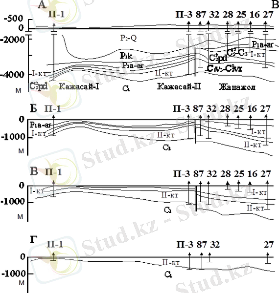 1. 2. 1 сурет-Жаңажол-Қожасай құрылымдар тобының Палеотектоникалық профильдері қазіргі уақытта (А), Кунгур дәуірінің басында (Б), Ассель ғасырының басында (В), Подол уақытының басында (Г)