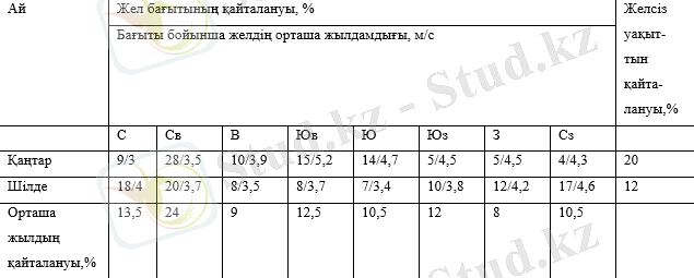 Аумақтың жер бедерінің жазықтығы желдің қарқынды болуына жағдай туғызады. Қысқы жел батыс бағытында, боран туғызады. Жазғы жел солтүстік-шығыс бағытында, ылғалдың тез булануына және топырақтың жоғарғы қабатының кебуіне себеп болады.