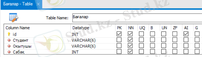 (12-сурет) Баға кестесіне id, Студент, Оқытушы, Сабақ, Баға, Дата деген қатарлар аштым.
