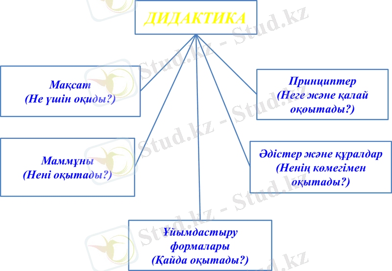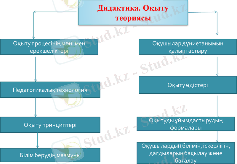 Сонымен бірге дидактика білім беру мен оқытудың мазмұнын, оқыту принциптерін, оқытудың ұйымдастырудың формалары мен әдістерін қарастырады.