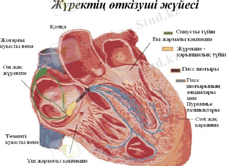 жиліктегі электр импульсін тудырады. Жүрекшелік қозудың таралуы СА-туйіннен басталып, үш туйінаралық, жолмен (Бахман, Венкебах жане Торель) АВ-туйінге және журекшеаралық Бахман шоғыры арқылы сол журекшеге таралады. Алдымен оң жақ, кейін оң және сол жақ, сонында-сол жақ журекше қозады. Ең бірінші қарыншааралық перденің сол бөлігі деполяризацияланады сонымен қатар оң қарыншаның көп бөлігі қозады. Қозу 0, 04-0, 05 с сол қарыншаның аздаған бөлігіне өтеді. Соныңда базальды бөлімдер яғни СК, ОК және қарыншааралық перде белсенділендіріледі.