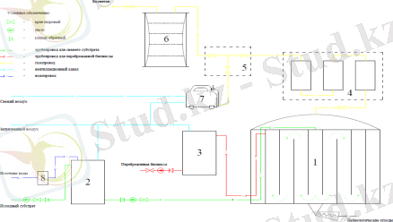 1-ферментатор, 2-бастапқы субстрат сыйымдылығы, 3-тыңайтқыш сыйымдылығы, 4-биогазды сүзу жүйесі, 5-тарату қондырғысы, 6-газ ұстағыш, 6 - газ электр генераторы, 8-электролизер