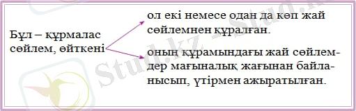 Жетекші сұрақтар қоя отырып, оқушылар өздері құрастырған құрмалас сөйлемдерді талдау арқылы мұғалім оларға құрмалас сөйлемнің өзіне тән белгілерін түсіндіреді: