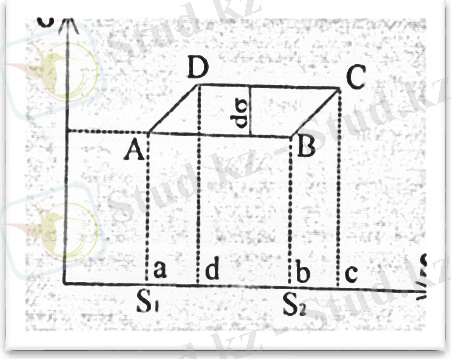 кескінделеді. Изотермалық созу кезінде беттік керілу коэффициенті өзгермейді. Жұқа қабық В күйге жеткеннен кейін оны шексіз қашықтыққа созғанда температурасы dT шамасына төмендеп, ал беттік керілу коэффициенті dσ артады. Жаңа күй С нүктесімен кескінделеді. Енді жұқа қабықтың D күйге дейін изотермалық кішірейуіне мүмкіндік берейік. Содан кейін жұқа қабық бастапқы А күйге келгенше кішірейуі адиабаталық түрде өтеді. Адиабаталық ұлғаю жұмысы bBCc ауданына, ал изотермалық кішірею жұмысы CcDd ауданына, адиабаталық кішірею жұмысы dDAa ауданына тең. Циклдің жұмысы жұқа қабықтың кішірейгенде және созылғанда істелетін АВСД ауданына сәйкес келетін (S 2 - S 1 ) dσ айырымына тең. Қыздырғыштан алынған жылу мөлшерінің шамасы δQ болса, циклдың пайдалы әсер коэффициенті мынаған тең [5-16] :