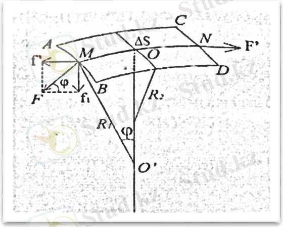 АВ және МО сызықтарында ОО' сызығымен қиылысқанша перпендикуляр жүргізіп, осы бағыттағы беттің қисықтық R 1 радиусын аламыз. Содан соң екінші қисықтық радиусы R 2 алу үшін BD сызығына ОО' сызығымен қиылысқанша перпендикуляр жүргіземіз. Қисықтық радиустары әртүрлі болғандағы жалпы жағдайды қарастырайық. F күшін ОО' сызығына параллель бағыттағы Р қысымын анықтайтын f 1 , күшке және осы күшке перпендикуляр біз қарастырып отырған жағдайда ескерілмейтін f' күшке жіктейміз. F және f’ арасындағы бұрышты ϕ арқылы (ϕ =< МО'О) белгілесек, төмендегі қатынастар шығады: