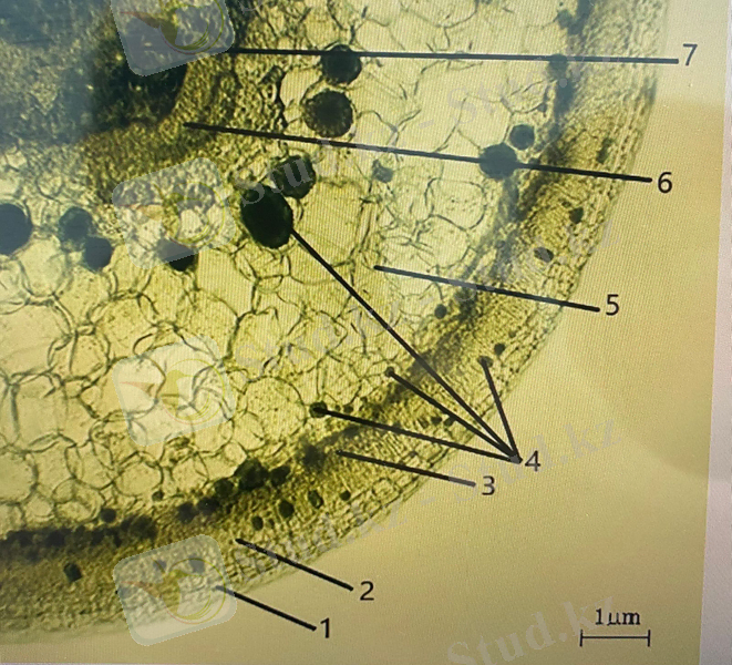 1 - эпидерма - гиподерма; 2 - палисадты жасушалар (бағаналы) ; 3 - кранц жасушалар; 4 - друзалар; 5 - су жинақтаушы ұлпа жасушалары; 6 - флоэма; 7 - ксилема.