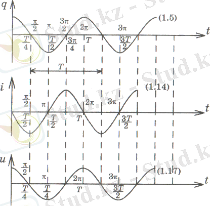Электромагниттік тербелістердің: зарядтың, ток күшінің және ток күшінің өзгеру жылдамдығының уақытқа тәуелділік графиктерін салайық. Ол үшін зерттеліп отырған шама уақыттың функциясы ретінде берілу кажет. Заряд үшін (1. 5) теңдеуін қолдануға болады, яғни