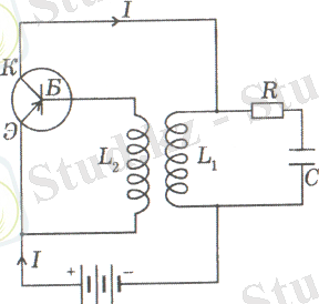 Ал, егер кернеу көзі тербелмелі контурға периодты түрде, конденсатордың оң полюске қосылған астары оң зарядталып тұрған уакытта ғана қосылса, конденсатор тек қана үстемелеп зарядталып отырады. Онда тербелістер өшпейді. Кілтті (транзисторды) осылайша қолдану үшін кері байланыс қажет. Ол үшін индуктивтік катушканы пайдалануға болады. Генератордың жұмыс істеу принципін түсіну үшін оның схемасын қарастырайық (1. 8-сурет) .