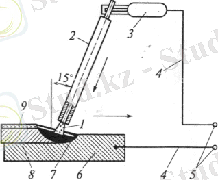 1. 1-сурет. 1-дәнекерлік доға; 2-электрод; 3-электрод ұстағыш (тұтқа) ; 4-дәнекерлік сым; 5-тұрақты немесе айнымалы тоқ көзі; 6- дәнекерленуші детал; 7-дәнекерлік ванна; 8-дәнекерлік табан; 9-шлактық қорка; бағдаршалар дәнекерлеу процесіндегі электрод қозғалысының бағытын көрсетеді.