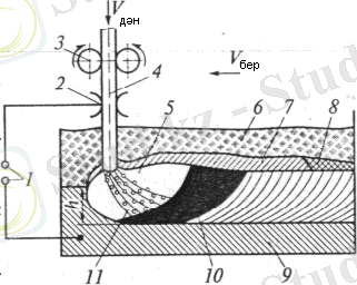 1. 2-сурет. 1- тұрақты немесе айнымалы тоқ көзі; 2 - сырғымалы контакт; 3 - бергіш механизм; 4 - электродтық сым; 5 - парагазды шөлмек; 6 - флюс; 7 - балқыған флюс; 8 - қатқан шлак; 9 - дәнекерленуші (негізгі) материал; 10 - дәнекерлік ванна; 11 - дәнекерлік доға; V дән, V бер - электродтық сым берілісі мен дәнекерлеу жылдамдығы; R - негізгі материалдық балқу тереңдігі.
