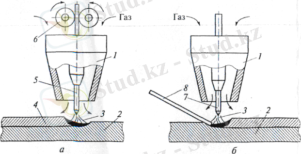 1. 3-сурет. Балқитын (а) және балқымайтын (б) электродтар мен қорғаныштық газ ортасында доғалық дәнекерлеу сызбасы: 1- жандырғы сабы; 2 - дәнекерленуші деталь; 3- доға; 4 - дәнекерлік табан; 5, 7 - балқитын және балқымайтын (вольфрамды) электродтар; 6 - беруші механизм; 8 - отырғызба материал.
