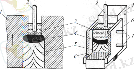 1. 4 - сурет. 1 - дәнекерленуші деталь; 2 - электрод; 3 - балқыған метал; 4 - дәнекерлік ванна; 5 - дәнекерлік табан; 6 - қозғалмалы кристализаторлар; 7 - салқындатқыш ауа өтпесі (жолы) ; Бағдаршамен дәнекерлеу бағыты көрсетілген.
