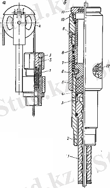 XVI. 15. сурет. Герметизаторлар а-қолмен басқарылатын; 1-тығыздағыш; 2-қысатын төлке; 3-гайка; 4-шкив; б-гидродинамикалық; 1-лабиринтті тығыздағыш; 2-корпус; 3, 9, 12-канал; 4-тығыздағыш; 5-муфта; 6- қысатын төлке; 7-серіппе; 8-төлке; 10-тығыздау; 11-тығын