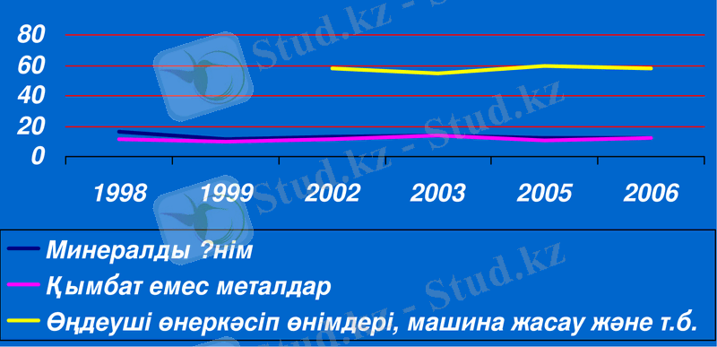 Ендi келесi тiкелей шетел инвестицияларының өнеркәсiп саласындағы үлесiн көре аламыз. Кестеден көретiнiмiз шетел инвесторларының тiкелей инвестиция тартудағы мақсаты бiздiң елдiң экономикасының тұрақты дамуы емес, қайта бiздiң елдiң қойнауындағы шикiзат қорының молдығы болып отыр. Олар өз инвестицияларын шикiзат саласына құю арқылы тез арада пайда тауып, елiмiздiң шикiзат бағытындағы тұрақсыз экономикалы ел бола беруiне ықыласты. Өйткенi, олар өңдеушi салаға инвестиция салса, ол салалар кейiн дамып, сол елдердiң өздерiне бәсекелес болып табылады. Сондықтан, елiмiз ұлттық экономиканың тұрақты дамуын қамтамасыз етуi үшiн отандық инвесторларды осы салаға тарту, отандық өнеркәсiп салаларын басты орынға қойып, оларға қолдау көрсетуi керек. 6