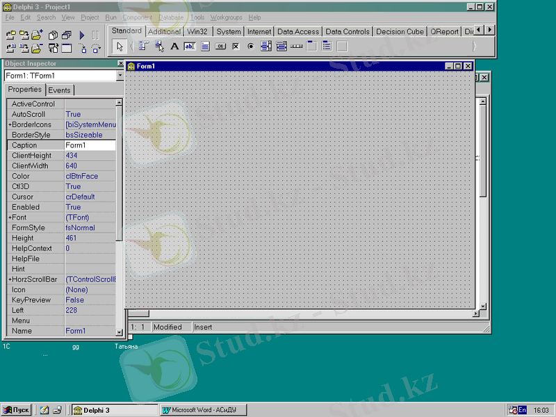 1- Delpi -дің негізгі терезесі 2. Форма(Form 1) ; З. Объект инспекторы терезесі (Object Inspector) . 4 . Модуль терезесі ( Программалық код терзесі)