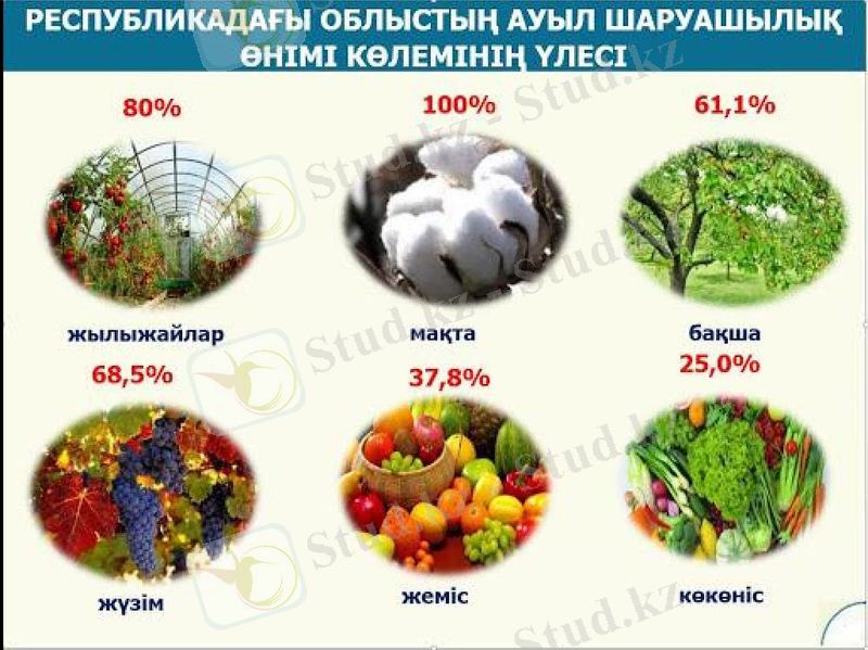Облыстан жеміс-жидек, жүзім, көкөніс өнімдері сондай-ақ бау-бақша өнімдері, макарон мен өсімдік майы, тері шикізаттары және мақта, басқа да ауыл шаруашылық өнімдері еліміздің басқа өңірлеріне жіберіліп отырады [4] .