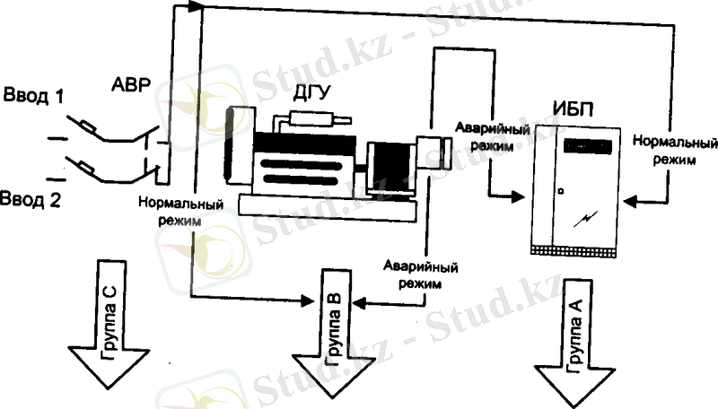 А, В, С топтарының электрмен қамтамасыз ету сұлбалары айтылған топтардың электрмен қамтамасыз етуге деген сенімділік дәрежесімен анықталады. А тобының электрмен қамтамасыз етілуіне сенімділіктің 1-ші категориясын қажет етеді және оны электрмен қамтамасыз ету, өзара қорек көздерін байланыстыратын, үш тәуелсіз қорек көзімен қамтамасыз етілуі тиіс. Сонымен қатар, қосымша қорек көзіне ауысатын кезде электрмен қамтамасыз етудің қысқа уақыттық үзулеріне кедергі келтуіне қарсы қосымша шаралар қабылдануы тиіс. В тобын электрмен қамтамасыз ету екі қорек көзінен орындалады, бірақ қосымша қорек көзіне ауысу кезіндегі үзуді болдырмау шараларын қолданудың қажеті жоқ. С тобын электрмен қамтамасыз ету 2 тәуелсіз қорек көзімен қамтамасыз еткен жөн, бірақ та бір көзге қосса да болады. Үшінші тәуелсіз қорек көзі ретінде жергілікті электрстанциялар, энергожүйелердің электрстанциялары ( генераторлы кернеудің шиналары), арнайы агрегаттар-үздіксіз қорек көздері, аккумуляторлық батареяларды қолдануға болады. Төменде қарастырылатын топтарда дизель-генераторлық құрылғы (ДГҚ) және үздіксіз қорек көздері (ҮҚК) үшінші қорек көзі болып табылады. Барлық тұтынушылар бір ғимаратта орналасқан, А тобы тәуелсіз қорек көздері санына сенімділік деңгейімен анықталады. Бұл А тобының электрмен қамтамасыз етілуі 2 сыртқы тәуелсіз қорек көздеріне (ДГҚ және ҮҚК-нен басқа) қосылғанда, С тобының электрмен қамтамасыз етілуі де сол 2 қорек көзіне байланысты, ал В тобының электрмен қамтамасыз етілуі 3 тәуелсіз қорек көзінен болады.