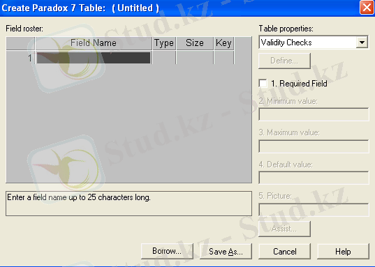 Мәліметтердің ең кіші элементі “өріс” деп аталады. Әр өріске ең алдымен ат (Field Name) беліледі. Ол өріс идентификаторы болып саналады. Идентификатор 25 символдан тұруы мүмкін, ескеретін бір жай- бос орыннан басталмауы керек (ішінде бос орын бола береді, бірақ оны қою белгілі бір қиындықтар тудырады) . Содан кейін өрістің типін (Type) таңдап алу керек. Өріс типін тышқанның оң жағын басу арқылы контекстік менюден таңдап алуға болады. Paradox7- де мынандай мүмкін типтер бар.