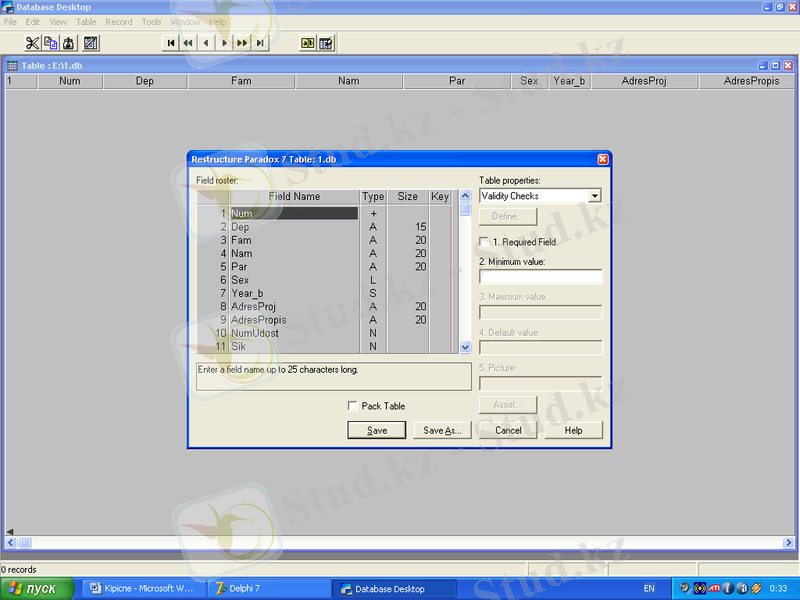Менің жұмысымда мен Autoincrement типін Num өрісіне, Alpha типін Dep, Fam, Nam, Par, AdresProj, AdresPropis, SemPol өрістеріне, Short типін Year_b өрісіне, Number типін NumUdost, Sik, Rnn, DomTel, MobTel өрістеріне, Sex, MedKom өрістеріне Logical типін, Charact өрісіне Memo типін және Photo өрісіне Graphic типін беру керек.