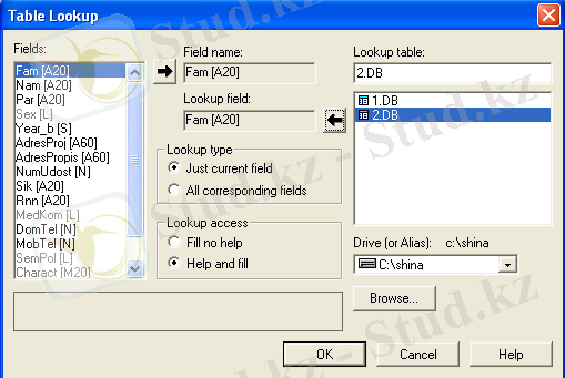 Drive or Alias сырғымалы тізіміне Browse кнопкасын басу арқылы қосымша кесте орналасқан папканы іздеп табамыз. Fields бөлімінен қосымша кестені, біздің мысалда ол 2, таңдап алып стрелка орналасқан кнопканы басу арқылы Field name өрісіне енгіземіз. Lookup table бөлігінен қосымша кестені 2 таңдап алып, Lookup Field өрісіне енгіземіз. Осыдан кейін OK кнопкасын басамыз.