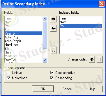 Сол жақ терезеде Fields мүмкін өрістер тізімі берілген. Indexed fields екінші индекске керек леген өрістер тізімін реттеп орналастырамыз. Сол жақ терезеден оң жақ терезеге өрісті өткізу үшін оны белгілеп алып стрелкасы бар кнопканы басу керек. Change order стрелкаларымен оң жақтағы терезедегі өрістердің орналасу ретін өзгертуге болады.