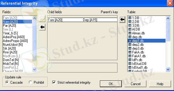 Fields панелінен керек деген өрісті таңдап аламыз. Біздің мысалда ол Fam өрісі. Стрелкасы бар кнопканы басу арқылы ол өрісті Child fields қосымша кестелер тізіміне енгіземіз. Оң жақтағы Table панелінен Parent’s key негізгі кестелер тізіміне қосамыз. Осыдан кейін ОК кнопкасын басамыз. Нәтижесінде төменгі суретте көрсетілген терезе ашылады: