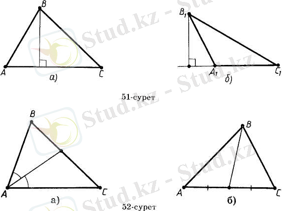 олардың В және В 1 төбелерінен биіктіктер жүргізілген. 51, а-суретте биіктіктің табаны үшбұрыштың қабырғасында жатыр, ал 51, б-суретте үшбұрыш қабырғасының созындысында жатыр.