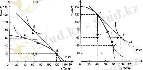 Өндірістік мүмкіндіктер қисығы мен орын басудың шекті деңгейінің қисығының әр елдегі конфигурациясы әр түрлі болған-дықтан, 1 -і және 2-і тауардың А және А1 нүктелерінде салыстырмалы бағалардың да өзгешеленетіні айқын. 1-і елдегі 1-і тауардың А нүктесінен өтетін түзу сызык арқылы тепе-тең салыстырмалы бағасы көрсетіліп, 2-і тауардың 1/4 бөлігін құрайды.